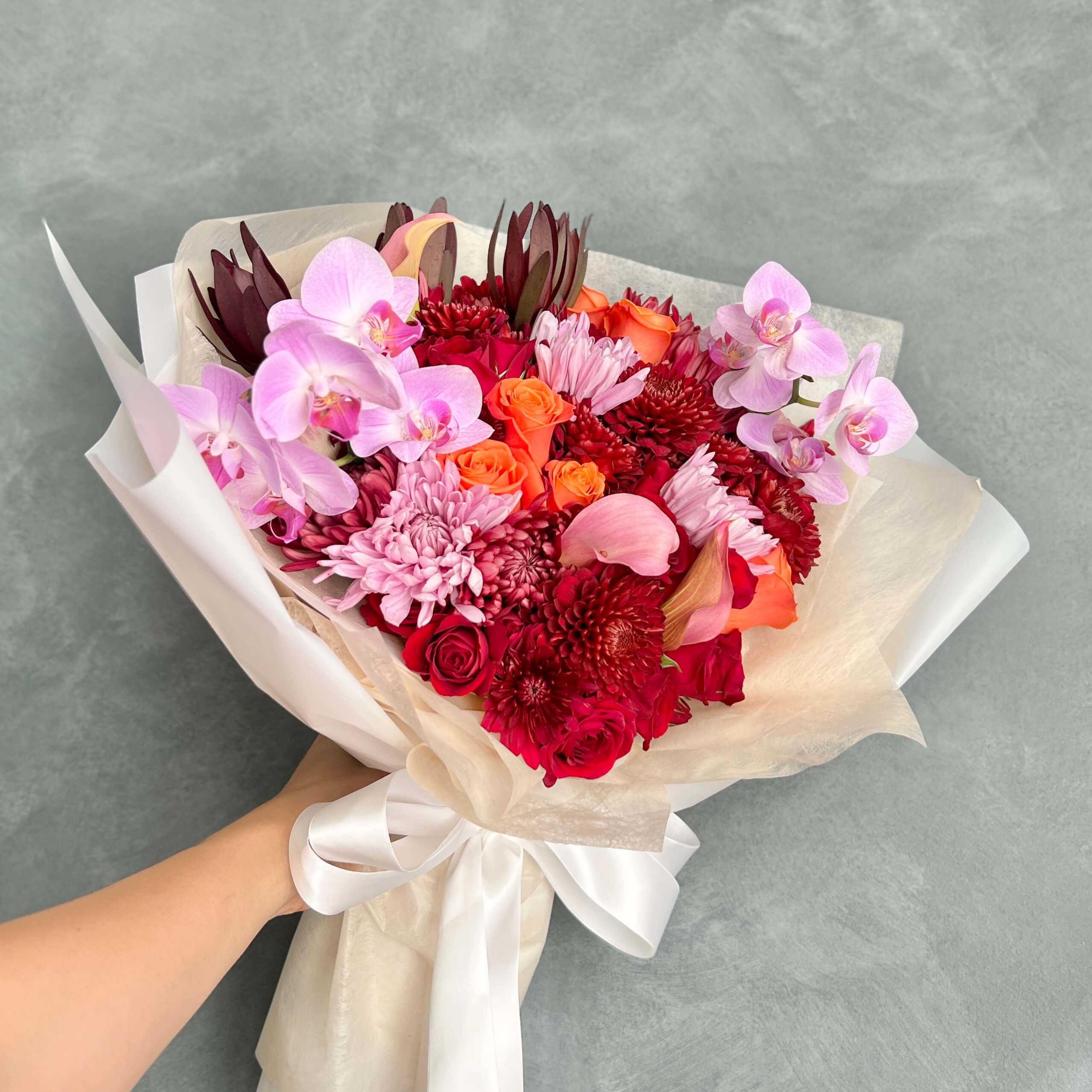 Bold, modern, and full of life — this bouquet features a striking mix of pink orchids, red roses, orange spray roses, calla lilies, and chrysanthemums.