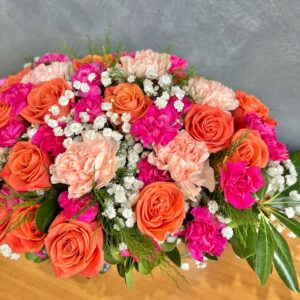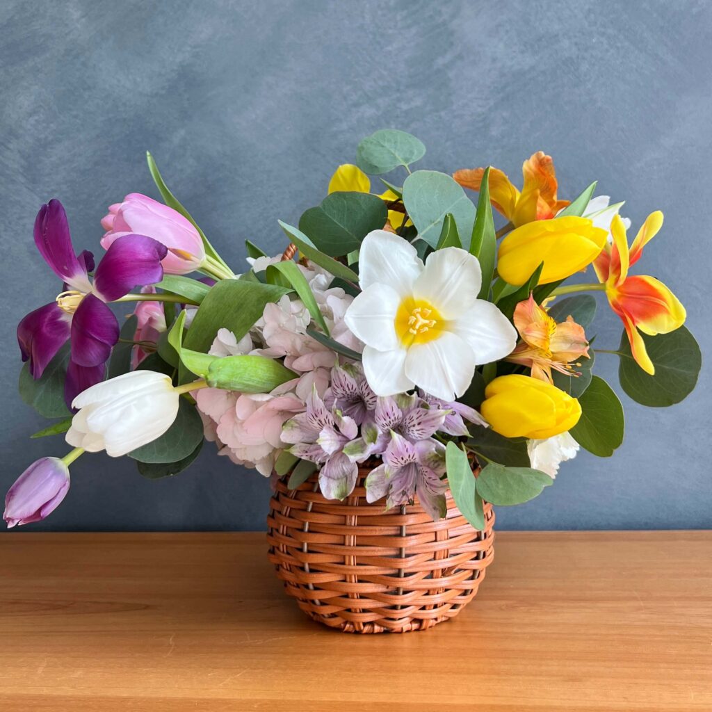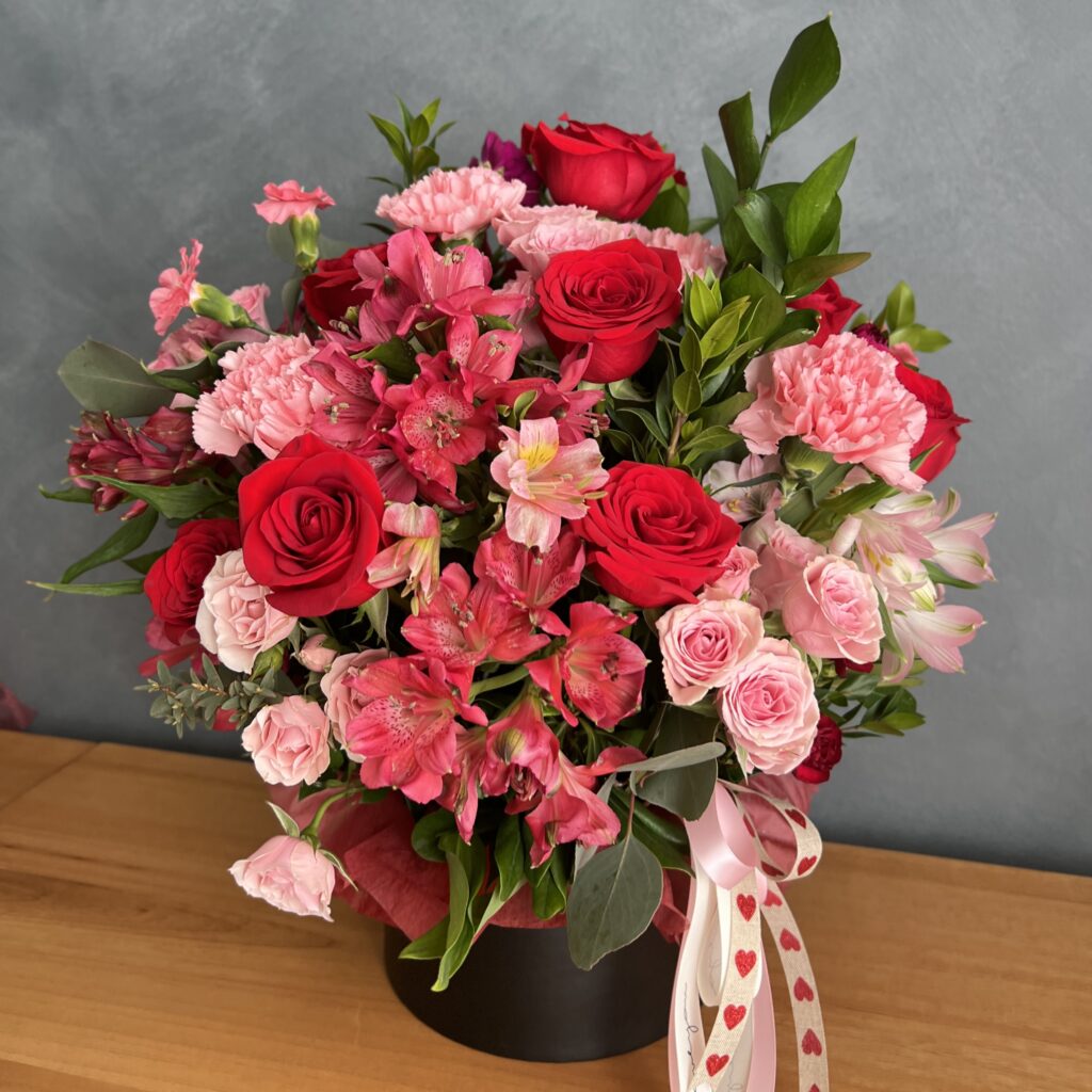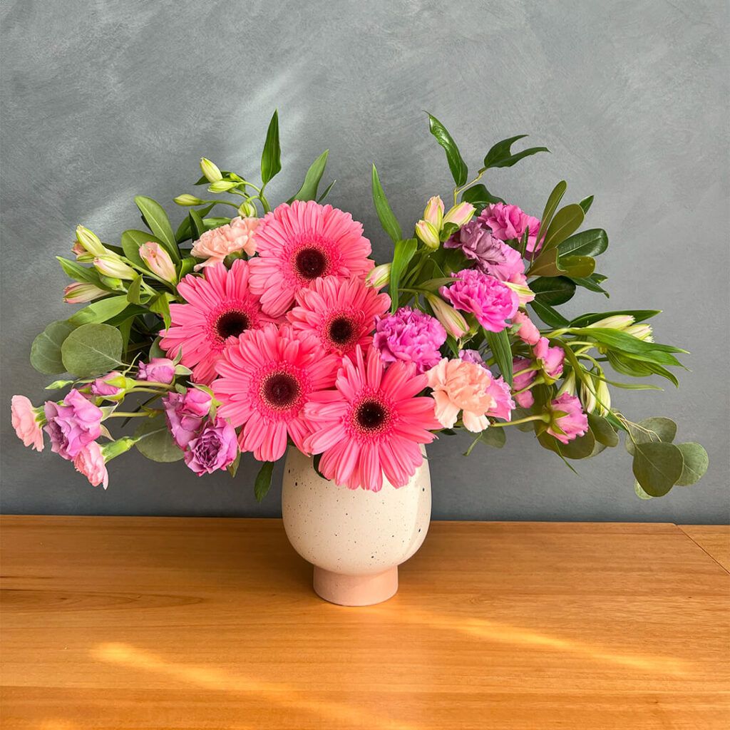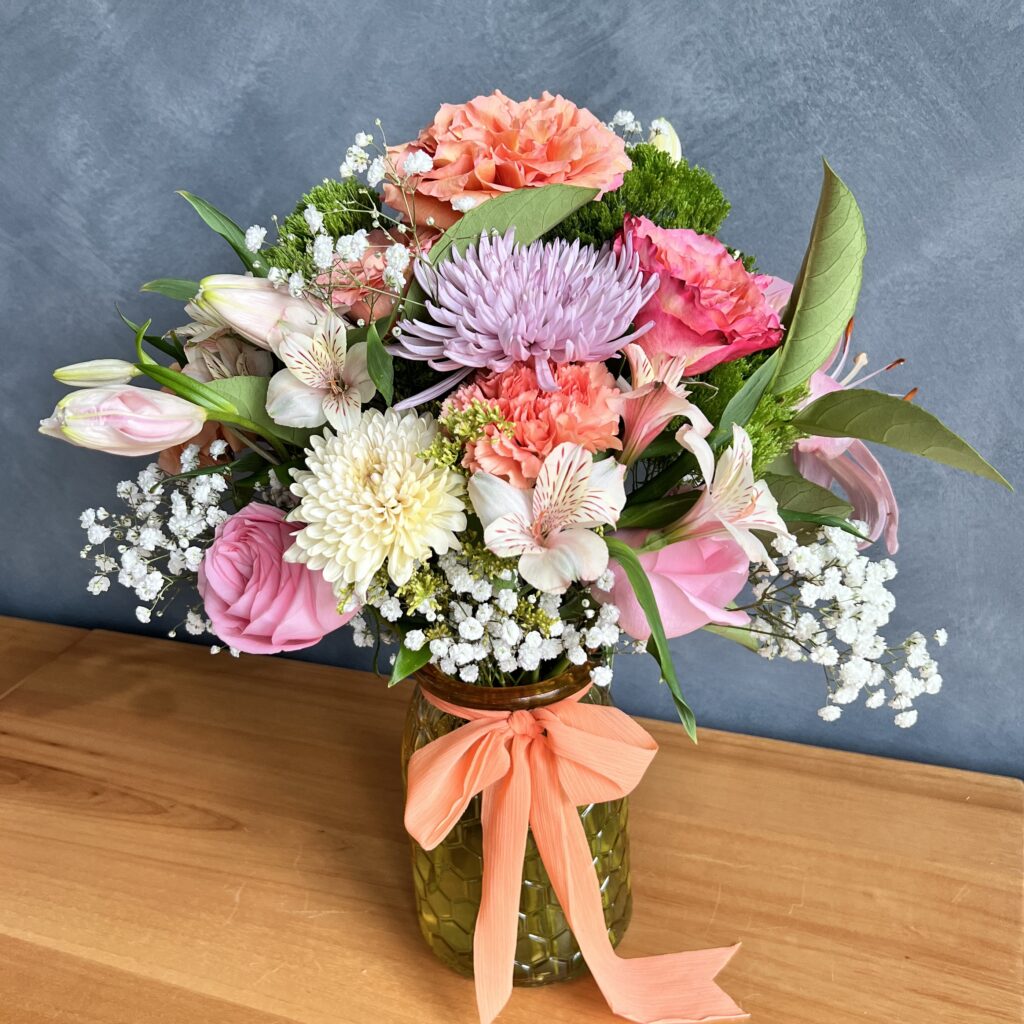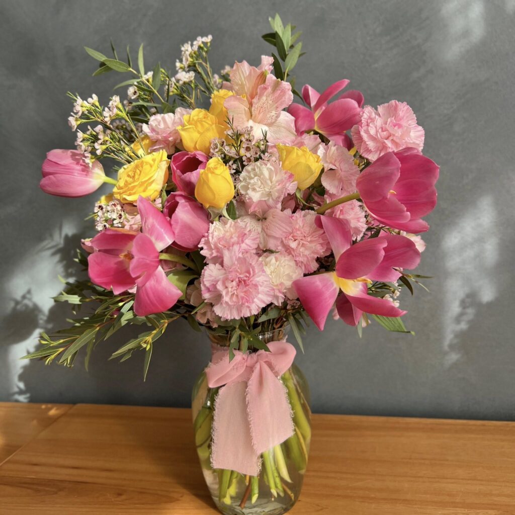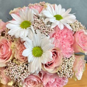 Original price was: $149.99.$89.99Current price is: $89.99.A delightful blend of soft pastels and vibrant greens, this arrangement captures the essence of a serene garden in full bloom. Featuring delicate pink daisies, airy blue hydrangeas, and crisp white alstroemeria, it exudes a fresh and romantic charm. Accents of tiny wax flowers and lush greenery add depth and texture, creating a beautifully natural…